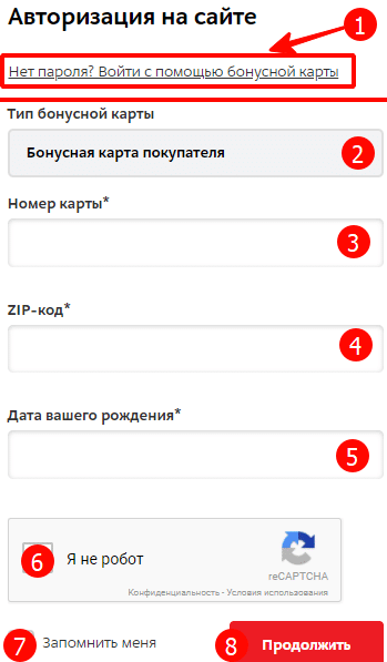 - Нажмите ссылку “Нет пароля? Войти с помощью бонусной карты”.