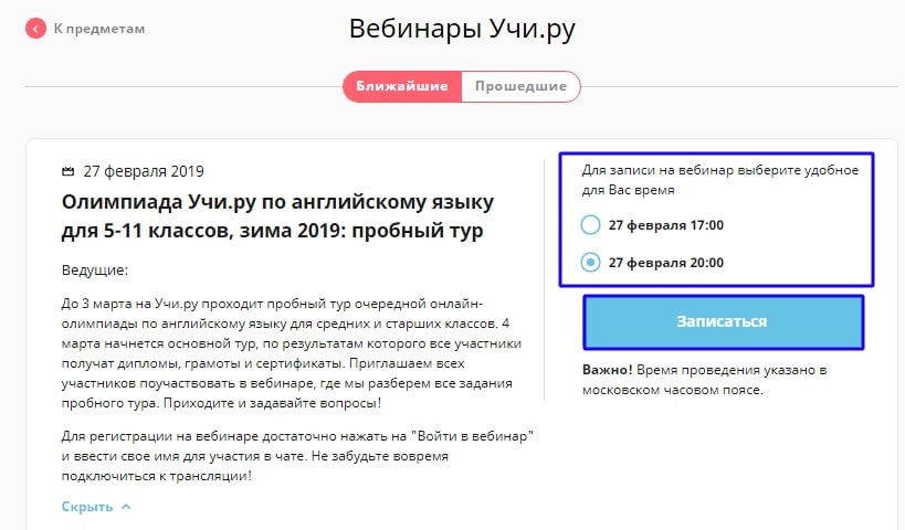 Перед участием в олимпиаде нужно основательно подготовиться. Для этого Учи.ру предлагает в личном кабинете зарегистрироваться на вебинар, где подробно разбираются правила и сложные вопросы. Внизу страницы ученика нужно перейти в соответствующий блок и в нем справа выбрать удобный период для участия и Записаться.
