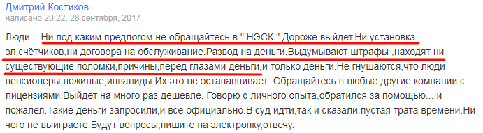 На другом форуме можно прочесть крайне негативные отклики от пользователей НЭСК. Здесь Дмитрий Костиков говорит, что компания при установке счетчиков, заключении договоров на обслуживание специально выдумывает штрафы, поломки, чтобы как можно больше взять денег с населения. У каждого пользователя есть возможность обращаться в разные компании, имеющие лицензии на осуществление деятельности и оказания услуг. Поэтому альтернатива в данном случае существует всегда.