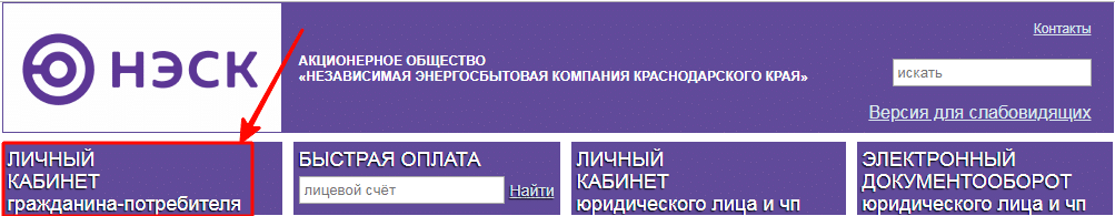 Посетить свою страницу можно только через сайт НЭСК, где слева выбрать “Личный кабинет гражданина-потребителя”. Затем, на открывшейся странице ввести логин и секретный код.